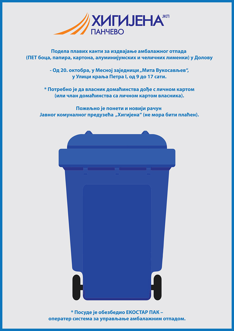 ЈКП „Хигијена“ Панчево започеће поделу плавих канти за издвајање амбалажног отпада у Долову, 20. октобра, у Месној заједници „Мита Вукосављев“, од 9 до 17 сати.