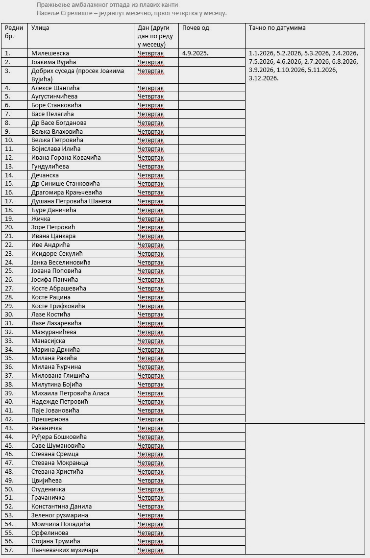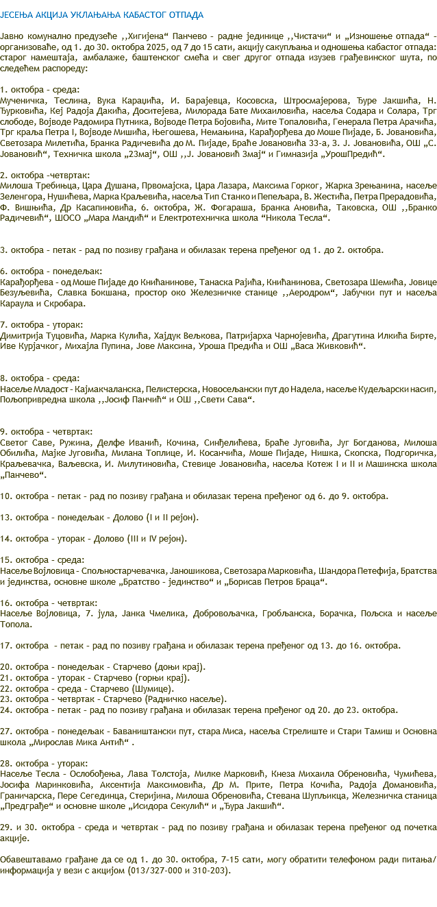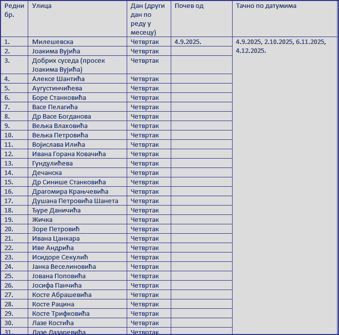 | I смена од 07,00 до 14,00 h- понедељак, уторак, среда, четвртак, петак- kонтејнери od 1,1m ( терен дели се по данима) | |